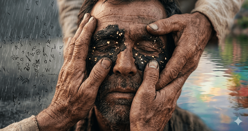 – il Creatore e l’Inviato. Usando polvere e saliva per fare del fango, Gesù compie un gesto che richiama la creazione dell’uomo, dimostrando che Dio usa la terra e la fragilità per comunicare la vita. Egli è il vero «Inviato» (Sìloe), colui che viene da Dio per agire anche quando la legge religiosa (il sabato) sembrerebbe proibirlo;