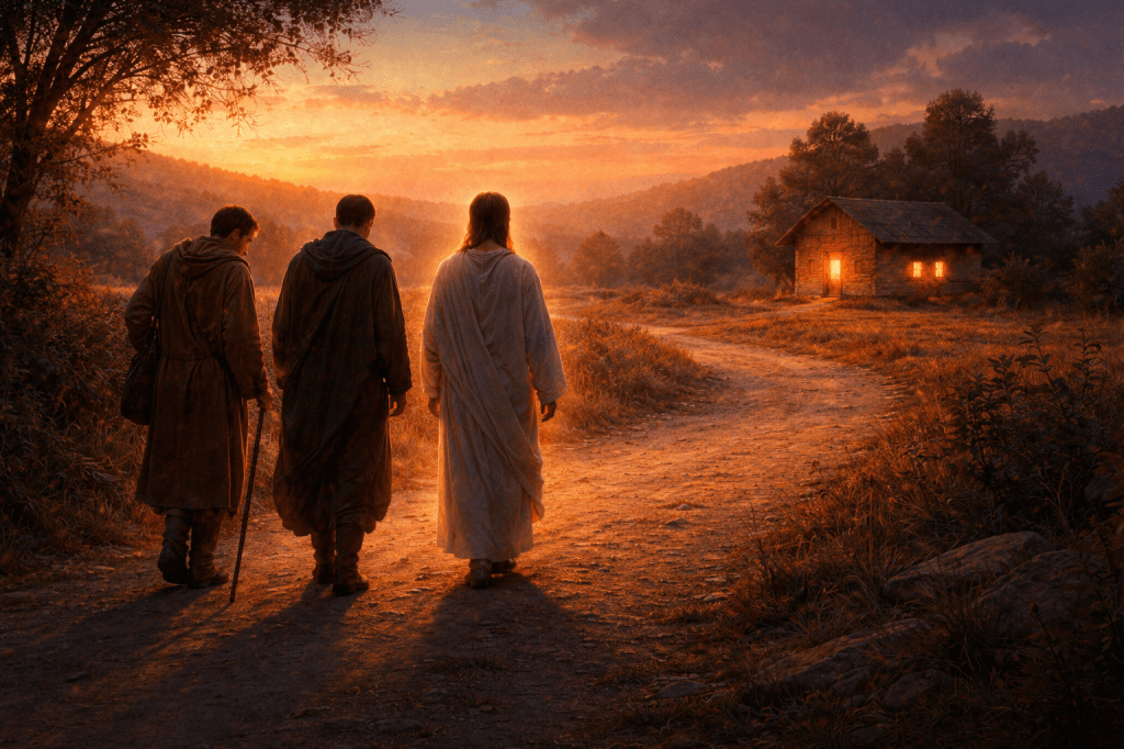 Due discepoli camminano nella sera, appesantiti dalla delusione, mentre accanto a loro Gesù Risorto è già presente, discreto e non riconosciuto. La luce che li avvolge e la casa in lontananza richiamano una speranza che ancora non vedono: è il segno che, anche nei momenti più oscuri, il Signore cammina con noi e ci conduce, passo dopo passo, verso un incontro che riapre gli occhi e il cuore.