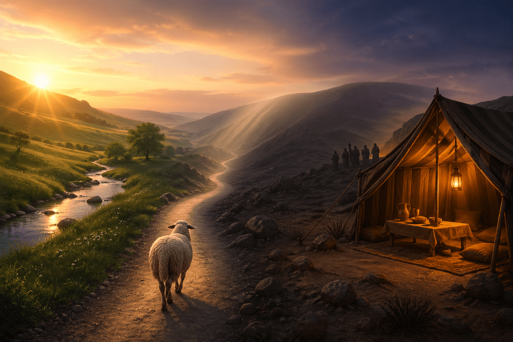 Un unico cammino attraversa pascoli luminosi, una valle in ombra e conduce a una tenda accogliente: è il segno della presenza fedele di Dio che guida, accompagna nelle prove e accoglie nella sua casa.